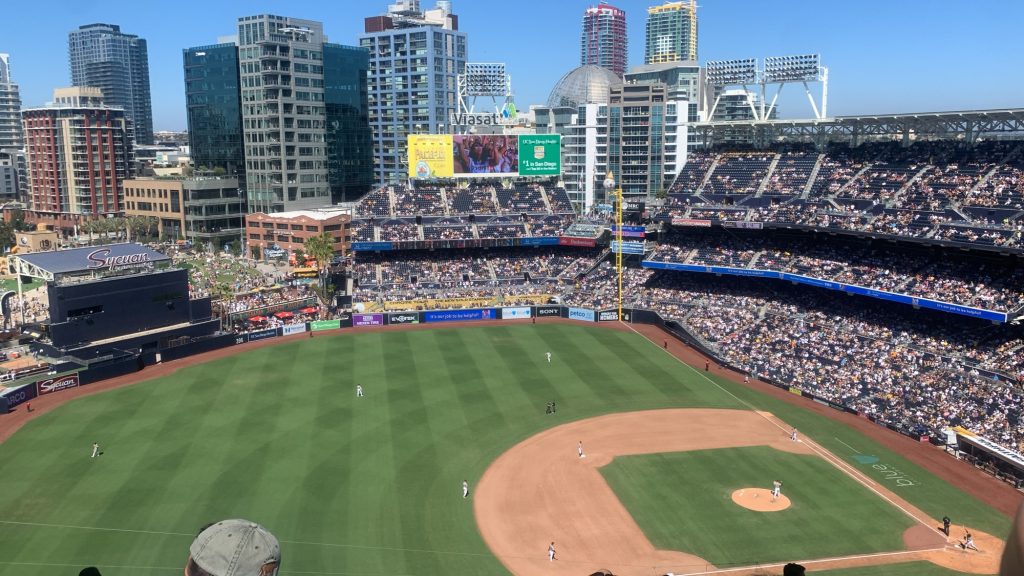 wollte danach eig frühstücken und zweite iced latte (das konzentrat geht mir immer besser rein) aber luka hat gefragt ob ich lust auf baseball spiel gucken hab. also geduscht und los nach downtown (i guess einfach ein paar hochhäuser, ich verstehe diese städte immer noch nicht). das stadion hat den prominentesten platz bekommen, das ist das zentrum der stadt.