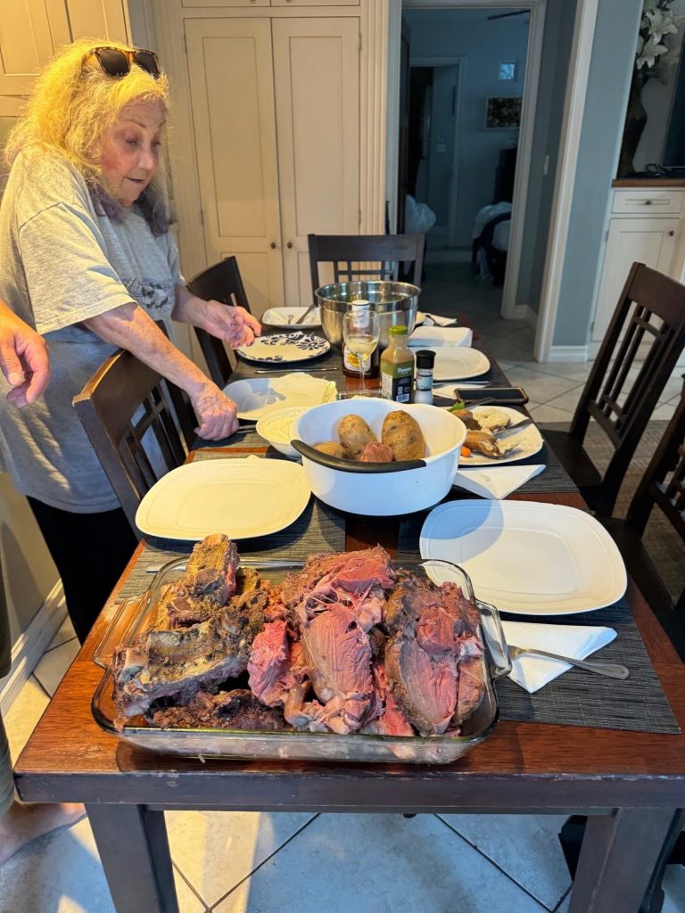 abendessen war dann prime rib, dedes spezialität. als sie früher nach deutschland zu besuch kam, hatte sie immer dieses 20kg fleisch paket in ihrem koffer. deshalb durfte das auch hier nicht ausbleiben, tradition quasi. dede isst ihr fleisch gerne sehr roh, ihre schwestern haben darüber gemeckert. ich fand’s schon hammer lecker.