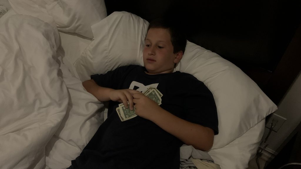 levin bekommt 5$ von milan, wenn er nicht neben ihm im bett, sondern auf dem teppich schläft.