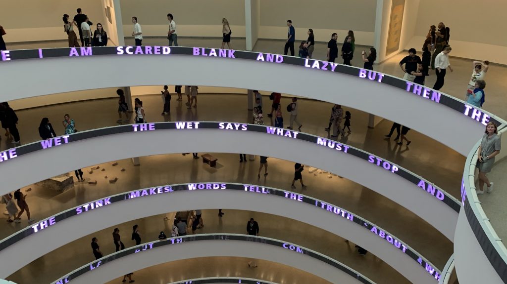 als wir uns gerade anstellen wollten um tickets zu kaufen, haben wir erfahren, dass in 2min der pay what you wish tarif losgeht. das timing war heute einfach gut. 10min später waren wir im guggenheim. zur zeit ist jenny holzer ausstellung und der led streifen lief die spirale nach oben. natürlich mit ai überarbeitet aber trotzdem ganz toll! manche sachen fand ich irgendwie lw aber den besuch war es auf jeden fall wert. geheimtipp!