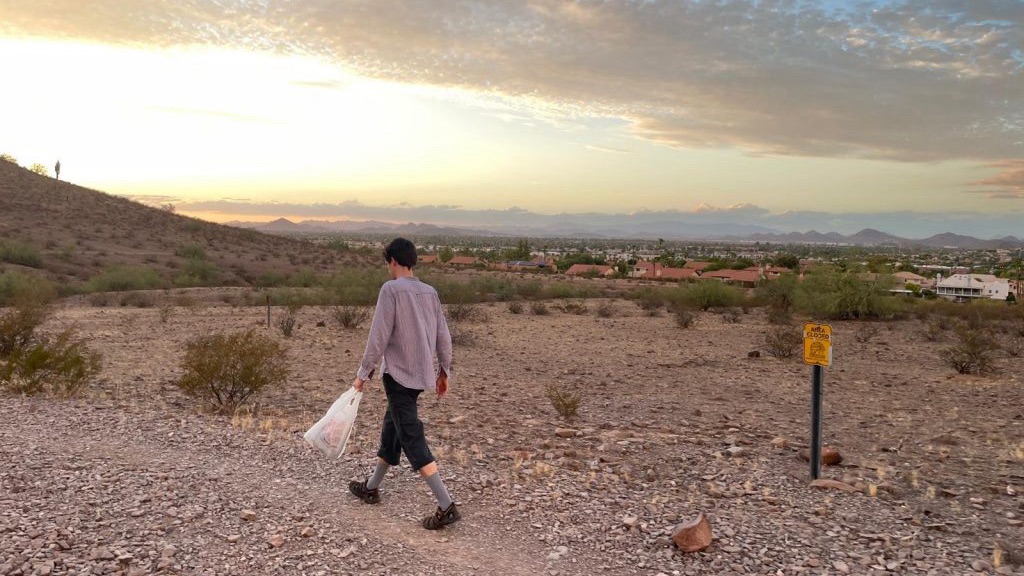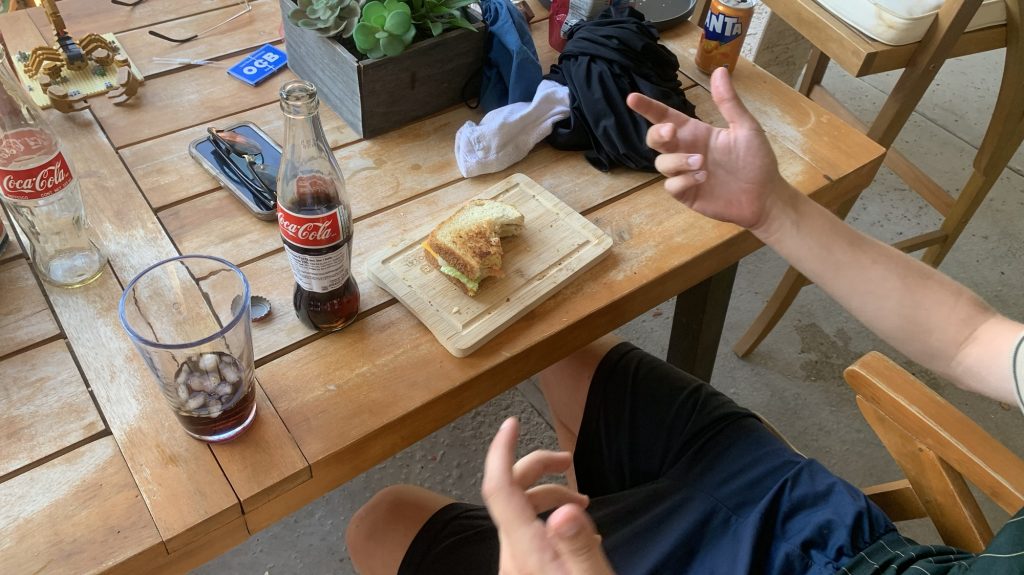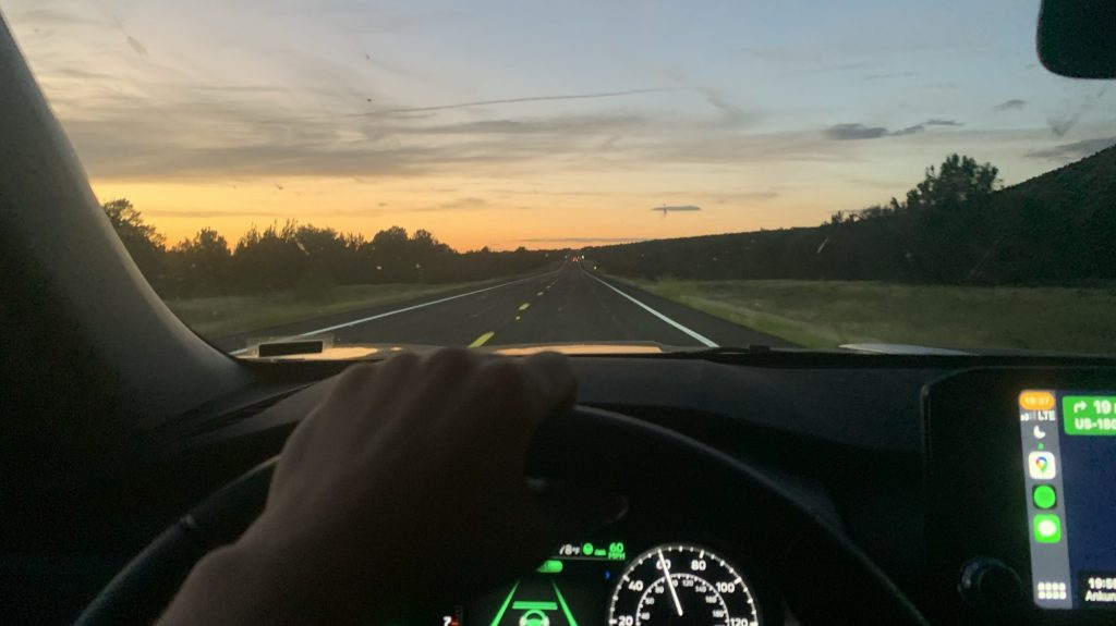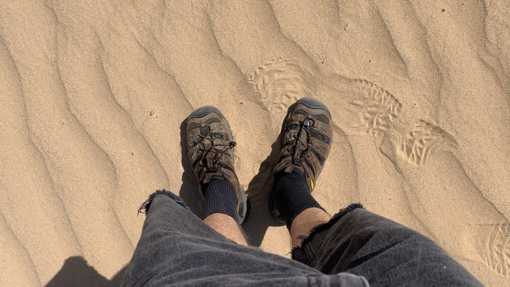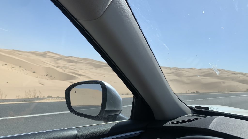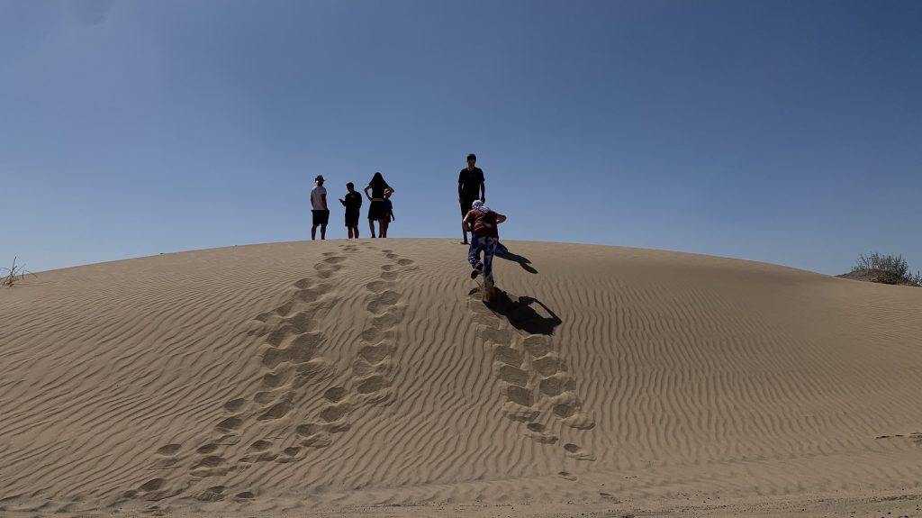 heute nicht verschlafen! hab meine hose zurückgegeben und mit einer dose liquid death (8.5/10) ging’s auf den highway. die laune war mittelmäßig, bei den temperaturen 7h im auto zu sitzen macht keinen spaß. die einzige möglichkeit satt zu werden ist ein fast food restaurant an der autobahn. die leute bleiben hier auf dem mcdonald’s parkplatz im runtergekühlten auto sitzen, bestellen online und lassen sich das essen auf den parkplatz liefern. gugu gaga. auf halber strecke sind wir in der wüste angekommen. für mich das erste mal in einer echten sandwüste! wie kommt der sand da hin? ist das einfach ein haufen sand auf normalem boden? warum weht das nicht weg?